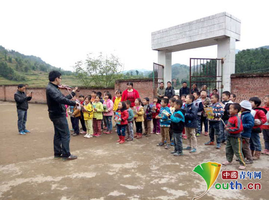 支教团成员刘昭恒用小提琴给孩子们演奏歌曲《两只老虎》、《上学歌》等。