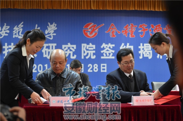 安徽财经网讯:11月28日上午,金种子酒业与安徽大学在金种子集团总部一楼会议室隆重举行“金种子——安大产业技术研究院”签约揭牌仪式。安徽大学校长程桦、副校长王群京、阜阳市委常委、副市长操龙灿,金种子酒业董事长锁炳勋等领导出席仪式。