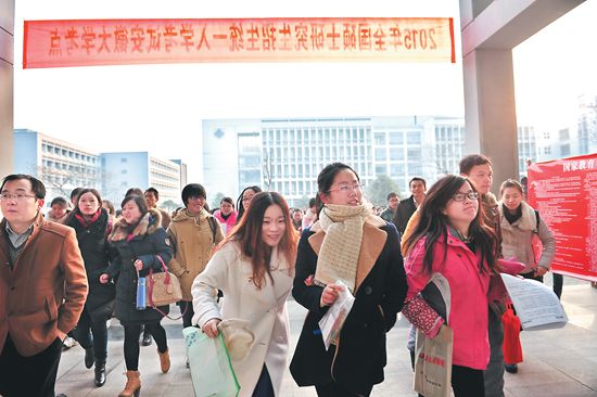12月27日,在安徽大学考点,考生进场。当日,2015年全国硕士研究生考试开考。我省此次硕士研究生考试报名人数达79888人,其中报考我省招生单位人数为42015人。 2014年度我省硕士研究生考试报名人数为8.2万人,此次报考人数比上年度有所下降。