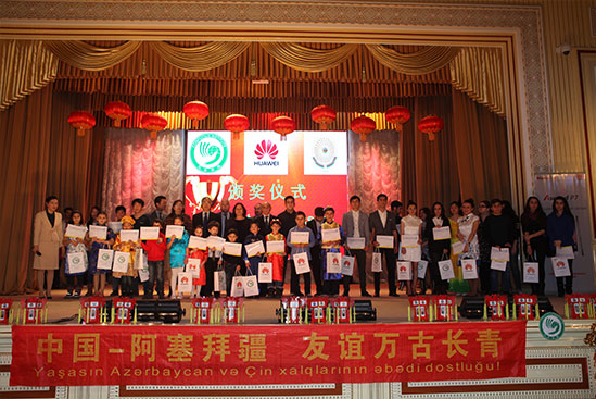 演出期间,宏大使、巴库国立大学副校长等为孔子学院春节系列文化活动“迎新年·写汉字”比赛、“迎新春汉语诗歌朗诵比赛”和“我的一堂课”汉语教学竞赛获奖的师生颁发证书和奖品。