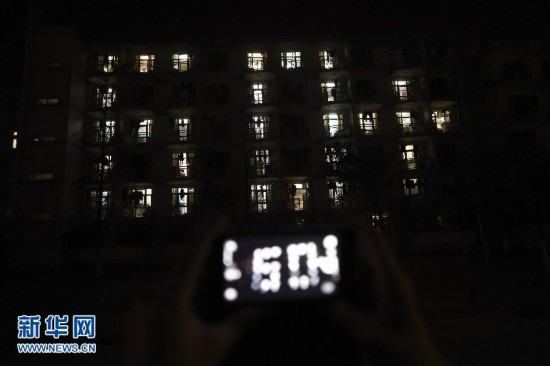 2015年3月29日 3月28日,安徽大学的学生们用宿舍楼的灯光拼出“60+”造型。当日,在安徽合肥,安徽大学环境保护协会在校园内开展“地球一小时”主题宣传活动,倡导大家节约用电,保护环境。新华社记者张端 摄