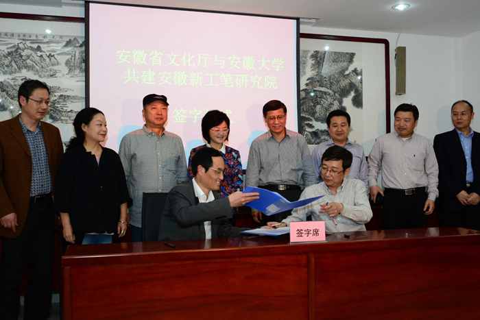安徽大学校长程桦、省厅副厅长唐跃在协议文本上签字。安大与省文化厅有关负责人、安大艺术学院师生代表等一起出席签约仪式。安大艺术学院院长、知名新工笔画家陈林主持仪式。
