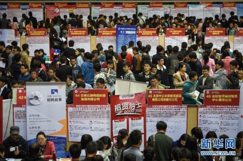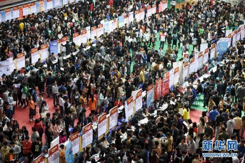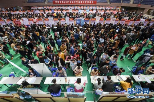 这是安徽大学2015年毕业生春季大型招聘会现场(4月15日摄)。4月15日,安徽大学2015年毕业生春季大型招聘会在该校磬苑校区体育馆举行,来自全国的190家用人单位进场招聘。