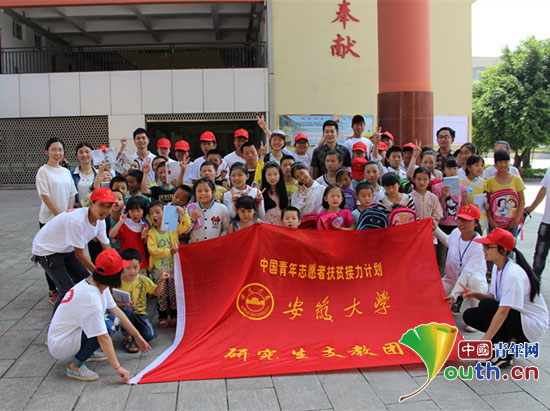 中国青年网北京6月2日电(记者李彦龙 通讯员 郑超)5月31日,时值儿童节来临之时,安徽大学第十六届研究生支教团(以下简称“研支团”)与支教地重庆市丰都县水天坪社区的留守儿童,在丰都职教中心的操场上,共同欢度了“六一”儿童节。