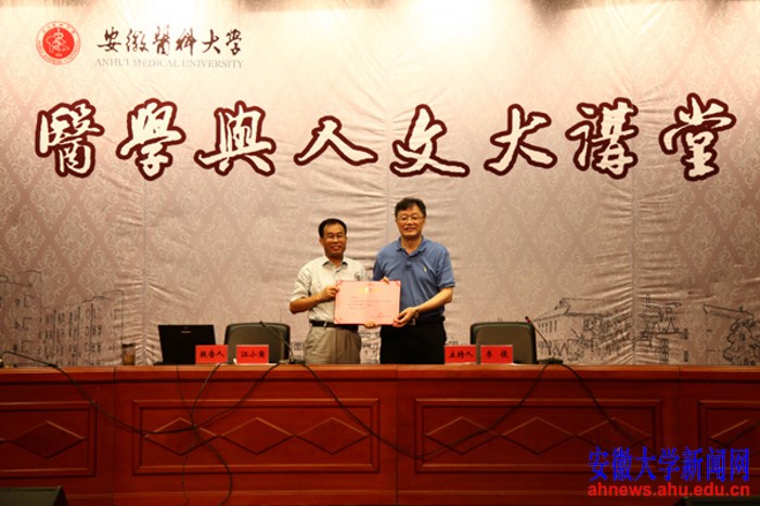 安徽医科大学党委书记李俊向江小角教授(左)颁发“医学与人文大讲堂”荣誉证书