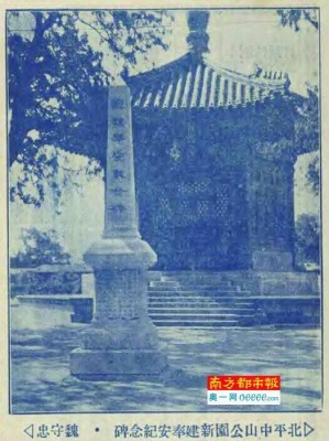 北京《中山公园志》里的《孙中山奉安纪念碑》说道:“1929年5月孙中山灵柩迁往南京中山陵奉安。由北平妇女协会、商民协会、总工会、农民协会、学生联合会5个团体发起,经北平市政府批准,在中山公园内建孙中山奉安纪念碑一座。经中山公园委员会提议该碑设在习礼亭以北,马路以南,与南坛门相对之处,同年6月30日兴建。纪念碑文由北京大学文学院国文系教授刘文典恭馔,计594字。1938年由公园拆下收藏。6月份被日占领军军部取走,公园曾向伪市公署报告备案。”