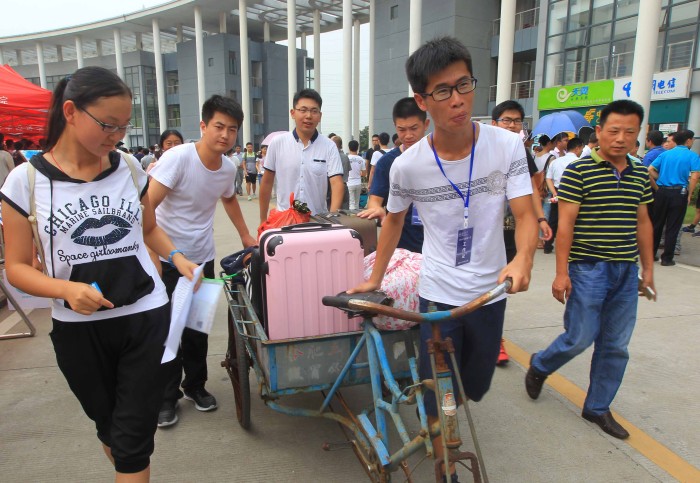 2015年8月31日 8月29日,学哥学姐志愿者帮大一新生运送行李。当日,安徽大学磬苑校区迎来2015级5100名本科新生。该校不仅在省城2个火车站和4个汽车站安排专车迎接,还为新生快速、便捷办理入学手续。(本报记者 姚林 摄)