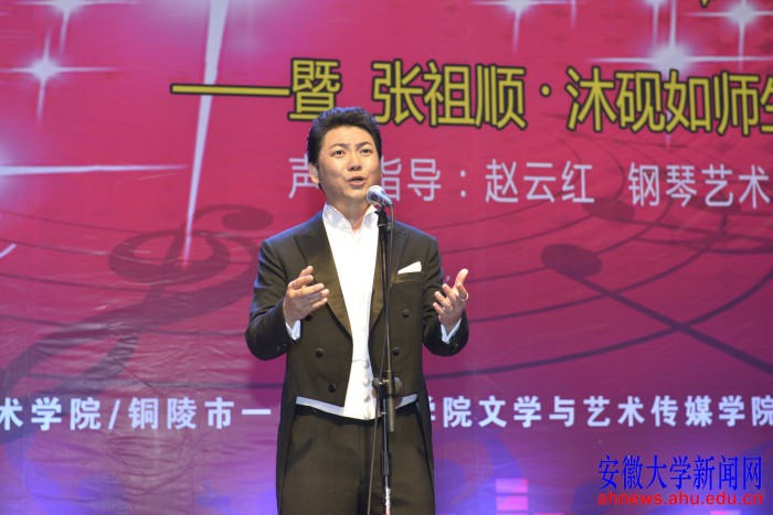 本网讯(徐红)安徽大学艺术学院张祖顺、沐砚如师生日前应邀在铜陵职业技术学院举行音乐会。他们分别用汉语、捷克语、意大利语、法语等演绎了《黄水谣》、《月亮颂》、《你是这样的人》、《沁园春·雪》、《黄河怨》、《娄山关》、《嘉陵江上》、《松花江上》、《跳蚤之歌》和《斗牛士之歌》等12首中外经典名曲。