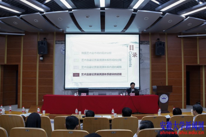 本网讯(学生记者 陆笑 沈劲松)10月15日下午,全国政协委员魏传忠在安徽大学文典阁学术报告厅作题为“把艺术品市场推向质量时代——构建艺术品鉴证质量溯源体系的探索与实践”的学术报告。校长程桦主持报告会。