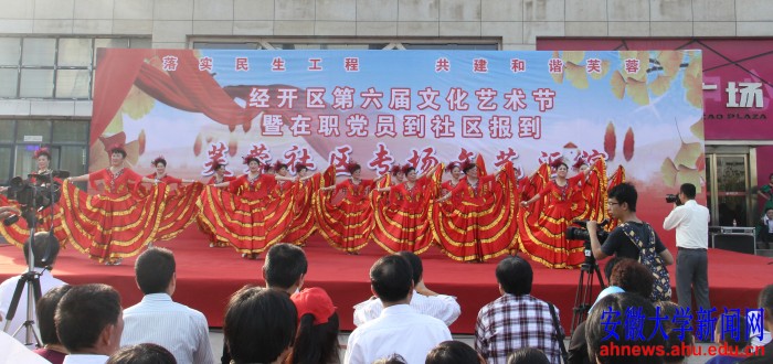 本网讯(学生记者 陆笑 薛熠凡)10月22日下午,合肥经开区第六届文化艺术节暨在职党员进社区芙蓉社区专场文艺汇演在港澳广场举行,我校与芙蓉社区选送的15个形式多样的精彩节目,为社区群众送上一份文化大餐。经开区党工委委员、社发局局长李应天,芙蓉社区党委书记、主任赵志刚,学校部分基层党委书记、副书记等,与社区500多名群众共同观看了文艺汇演,校党委常委、组织部部长周飞出席并讲话。
