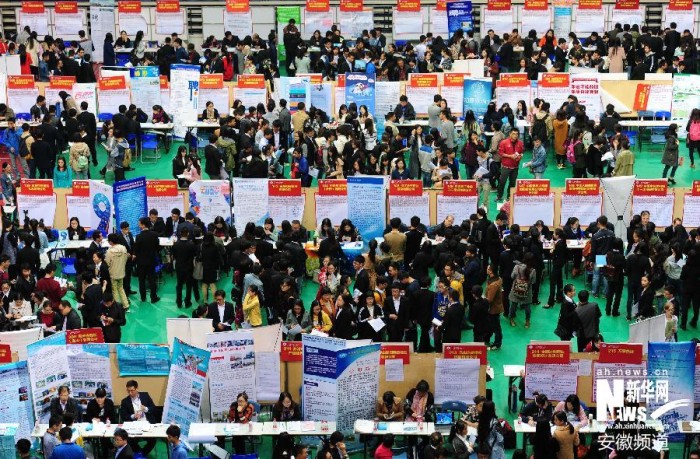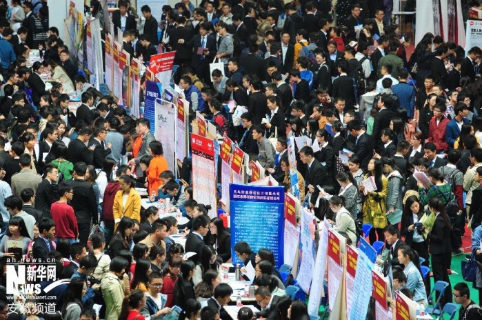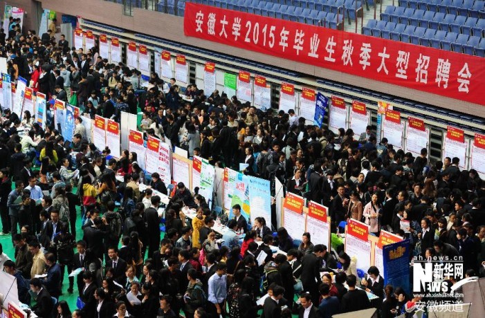 11月4日,众多求职者在招聘会上寻找合适的岗位。当日,安徽大学2015年毕业生秋季大型招聘会在该校磬苑校区体育馆举行,来自安徽省内及长三角地区的260余家企业进场招聘,提供涉及电子机械制造、网络科技、生物医药、教育文化、金融等类别的就业岗位8000余个,吸引众多应届毕业生到场求职。新华社发(徐勇 摄)