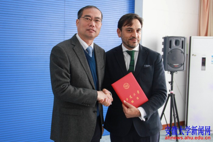 本网讯(学生记者 邹颜灵 严媛媛)11月10日上午,西班牙Pontifica Comillas大学Emiliano兼职教授聘任仪式在磬苑校区办公楼B202室举行。副校长俞本立向Emiliano颁发安徽大学兼职教授聘书。社会与政治学院副院长、拉丁美洲研究所所长范和生主持聘任仪式,国际合作与交流处处长郭志远和Emiliano教授签署了合作框架协议。