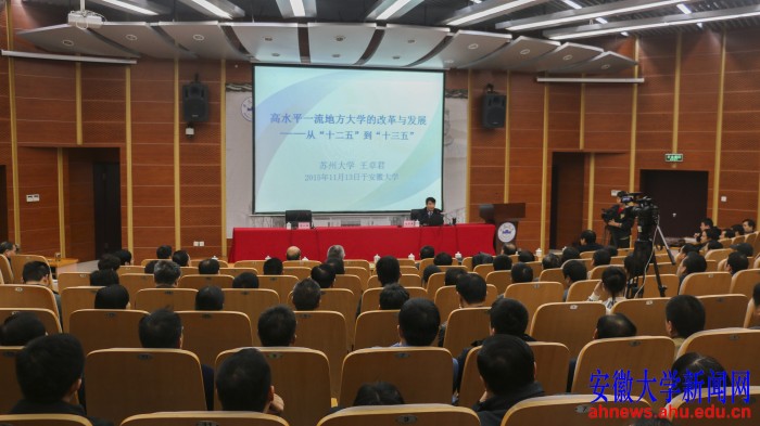 本网讯(新闻中心 陈欣 学生记者 沈倩 田先进)11月13日下午,校党委在磬苑校区文典阁报告厅召开理论学习中心组(扩大)会,邀请苏州大学党委书记王卓君作题为“高水平一流地方大学的改革与发展——从‘十二五’到‘十三五’”的报告。安徽大学党委书记李仁群主持报告会。