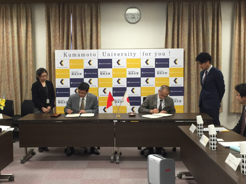 程桦校长(左)与熊本大学校长原田信志共同签署两校师生交换和科研合作协议。(日本新华侨报网)