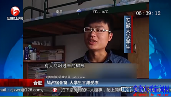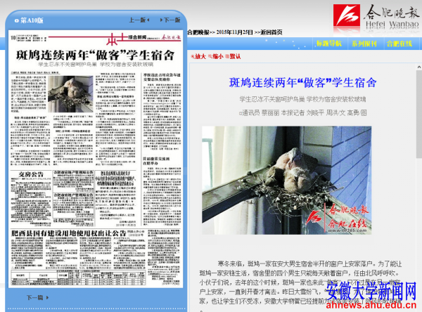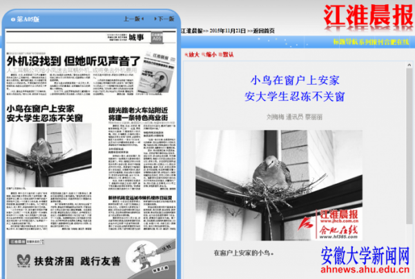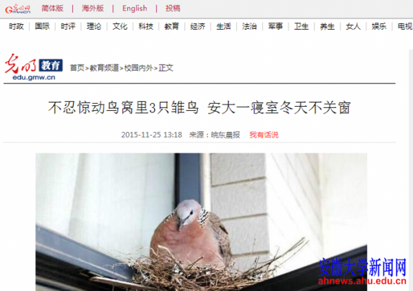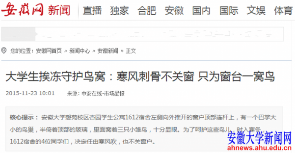 光明网《不忍惊动鸟窝里3只雏鸟,安徽大学生寝室冬天不关窗》、安徽电视台《鸠产子宿舍窗外搭窝,安徽大学学子冬天不愿关窗》、市场星报《大学生挨冻守护鸟窝:寒风刺骨不关窗,只为窗台一窝鸟》、合肥晚报《斑鸠连续两年“做客”学生宿舍,为呵护鸟巢不忍关窗》和江淮晨报《小鸟在窗户上安家,安大学生忍冻不关窗》等报道均从不同角度对我校学生的爱心善举予以赞赏。