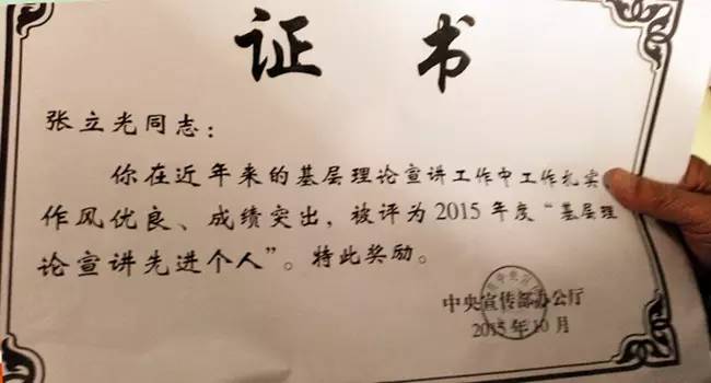 最近,张立光老先生被中宣部评为2015年度“基层理论宣讲先进个人”。老人手握着证书激动不已,他在证书上的复印件上写下这样两句话:“这是我收到的最高奖励,感谢党对我的教育和培养。”张立光老人是这么说的。