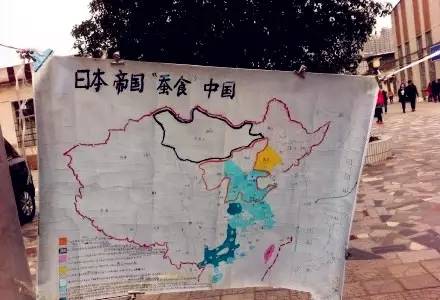 张立光老先生这次宣讲的主题是《日寇蚕食中国》。他的讲述有别于历史课本,说的不少内容都是他的亲身经历或感受,再加上老人自己手绘的地图和记录的资料,学生们看起来一目了然,听上去更加生动。图为张老自己制作的“日本帝国蚕食中国”地图。