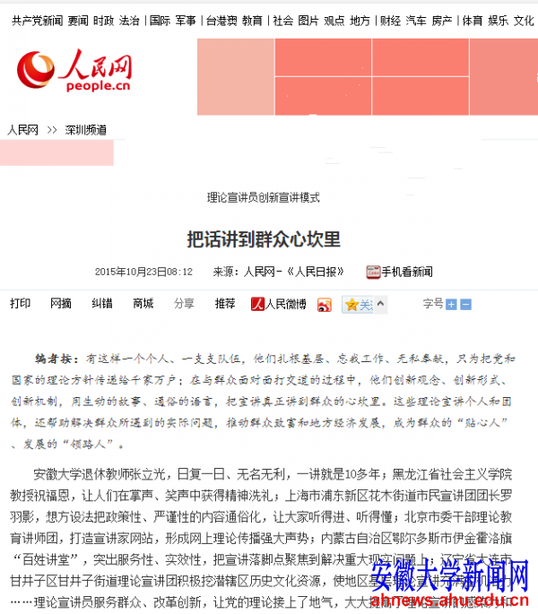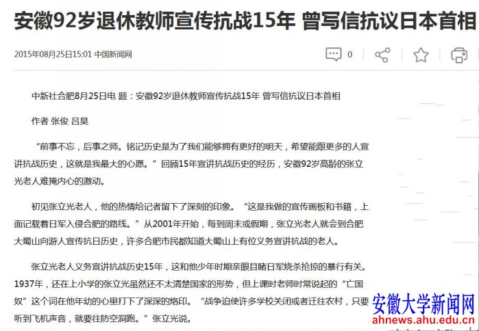 2015年10月23日《人民日报》刊登评论文章《理论宣讲员创新宣讲模式把话讲到群众心坎里》一文,文章开篇即引张立光为例,“安徽大学退休教师张立光,日复一日、无名无利,一讲就是10多年”,对张立光宣讲抗战史实的行为和方式予以高度评价。8月23日,《经济日报》特别报道刊文《耄耋老人的历史课堂》,对张立光事迹进行了全面报道。8月25日,中国新闻社发表《安徽92岁退休教师宣传抗战15年 曾写信抗议日本首相》一文。11月29日,安徽电视台《安徽新闻联播》以《张立光:耄耋老人心口相传抗战爱国精神》为题,对张立光的宣讲事迹进行了专题报道。12月5日,《安徽日报》在第二版头条位置刊发文章《张立光:耄耋教授十五载登山讲“抗战”》,报道了张立光老师十余年来坚持不懈义务宣讲抗日历史的事迹。12月8日安徽广播电视台《安徽之声》节目播发《最真的历史在这里——听92岁安大退休老师讲述那段日本”蚕食“中国的黑色记忆》,并配发评论《新闻瞭望》观察员评论。