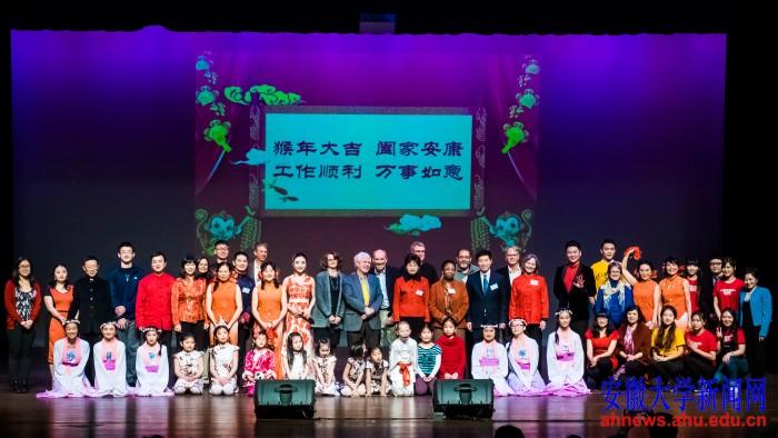 本网讯(艺术学院)当地时间2016年1月31日晚,美国科罗拉多州立大学孔子学院2016年春节晚会在柯林斯堡林肯中心上演,安徽大学艺术学院教师张祖顺携弟子黄刚应邀参加演出。