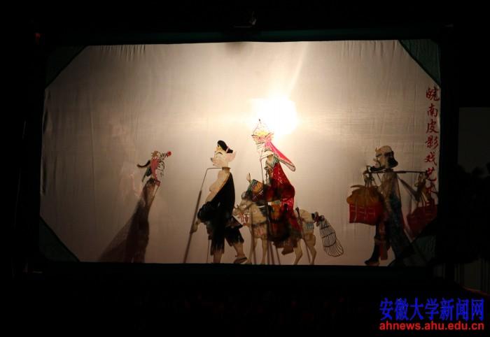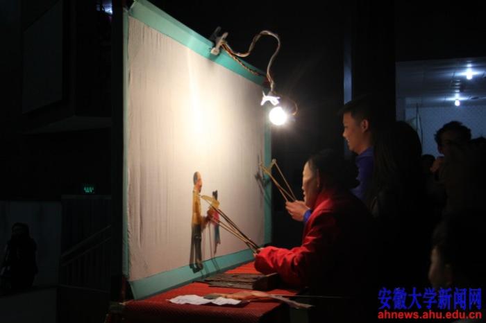 本网讯(学生记者 周丽)3月16日,皖南皮影戏曲艺术团走进安徽大学,让同学们“零距离”接触“光影中跳动的精灵”——皮影。本次活动由教务处主办、艺术学院承办。来自宣城市皖南皮影戏曲艺术团的何泽华、方宗堂、柯玉英和吴金陵4位艺人,凭借巧夺天工的雕刻技术、圆润的唱腔、杂而不乱的操纵绝技给观众带来一场视觉与听觉的盛宴。