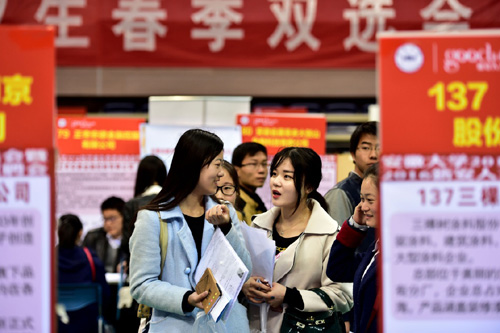 4月6日,求职大学生在招聘会上交流。新华社记者 刘军喜 摄