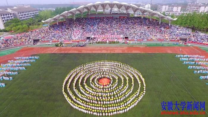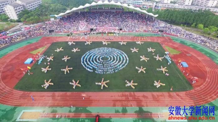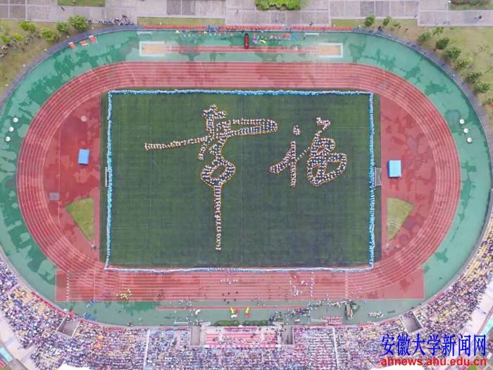 “你在博南的晨曦里,书声朗朗……”随着改编版《南山南》歌曲的响起,场上红、黄、蓝三色交错层叠,俯瞰下去宛若一朵朵鲜花在场上争相怒放,形成“安徽大学”、“1928”、“AHU UNIVERSITY”等字样,各院系的旗帜也从四面八方汇聚起来,武术、排球、羽毛球、跆拳道、舞龙舞狮等项目也相继呈现在现场,与掌声雷动的看台相映成趣。最终,代表本届开幕式理念的“幸福”字样呈现在体育场中央。