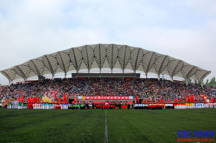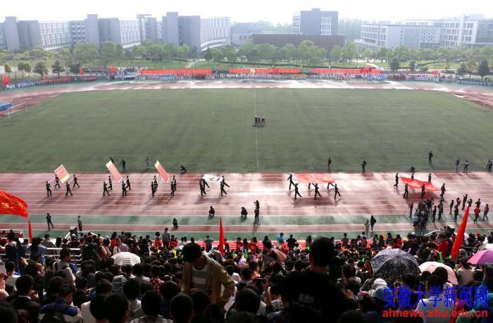 本网讯(学生记者 文字:潘泽昊 袁梅 郭策 沈劲松,摄影:徐鹤 田先进 刘成浩 陈祖奋)4月21日上午,安徽大学第54届田径运动会在磬苑校区体育场隆重开幕。本届田径运动会共有22支代表队696名运动员同场竞技,参加4个组别52个比赛项目的激烈角逐。同学们将在为期三天的运动会中张扬奋发向上的活力,释放生龙活虎的激情,将以飞扬的青春和强健的体魄展示“更快、更高、更强”的体育之魂。