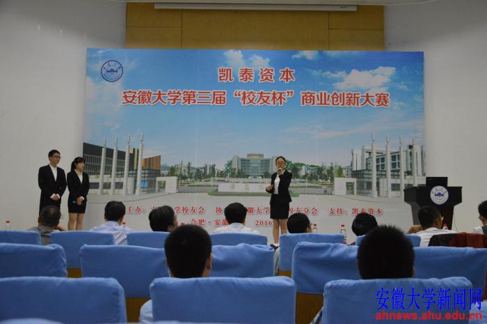 本网讯(学生记者 张琪 江紫妍)5月14日下午,由安徽大学校友会主办、安徽大学浙江校友会协办的安徽大学第三届“校友杯”商业创新大赛决赛,在磬苑校区博学北楼D101水上报告厅落下帷幕。管理学院13级学生梁仕林等6名同学组成的代表队提出的“追影——户外旅游020垂直电商平台”商业创新方案从众多队伍中脱颖而出,以84.833的最高分获得特等奖。渔乐圈团队、绿野仙踪团队获得了一等奖,OCCUPY跑跑团队、ALPHA纯野派团队、ON游戏运动团队获得了二等奖,WOW!去团队、扑通APP团队、逸行团队和生态圈团队获三等奖。