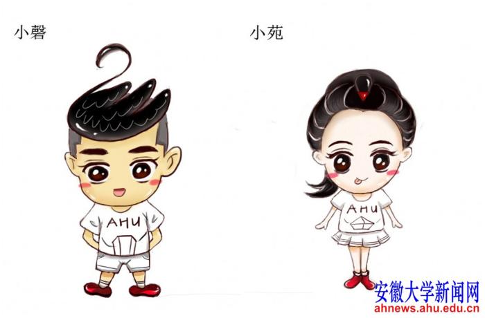 卡通人物男生“小磬”、女生“小苑”的设计灵感主要来自学校具有代表性的事物,其中发型灵感来源于鹅池中黑天鹅的轮廓,“小磬”身上所着文化衫印有标志性建筑文典阁的简笔画,“小苑”衣服上的则是磬苑体育馆的形状, “小磬”和“小苑”的文化衫上还印有安徽大学英文缩写AHU字样。卡通形象使用手绘设计,希望呈现安徽大学学子真诚热情、青春洋溢的形象。
