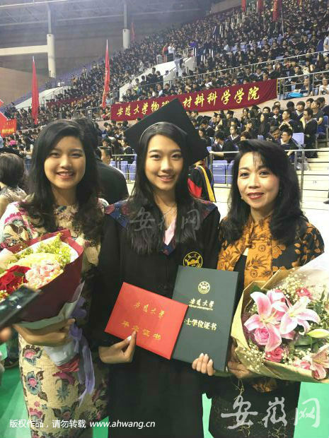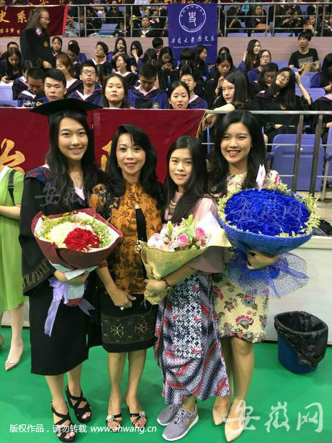 在家长席中,美丽的印尼母女四人因超高颜值引人注目,她们是安徽大学印尼留学生江小芳和她的妈妈、姐姐、妹妹。江小芳今年22岁,就读于安大国际贸易专业,她说在安大的四年学习生活很美好,安徽人都很友善,作为华侨的她一点没有在异国他乡的感觉。