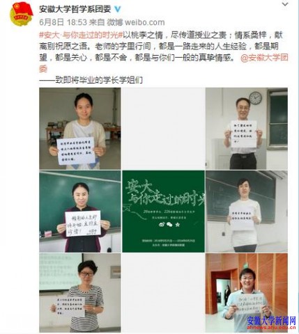 安徽大学官方微博发起话题“安大·与你走过的时光”,邀请广大师生留言,为毕业季发声,该话题目前阅读量达26万余次,发起232次讨论。