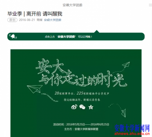本网讯(新媒体联盟秘书处 学生记者刘思琪)又是一年毕业季,由安徽大学新媒体联盟主办的“安大·与你走过的时光”2016年毕业季新媒体主题月活动,在微博、微信、QQ等平台以图文、H5动画、视频等多种形式为毕业季献礼,给2016届毕业生留下一段难忘的回忆。