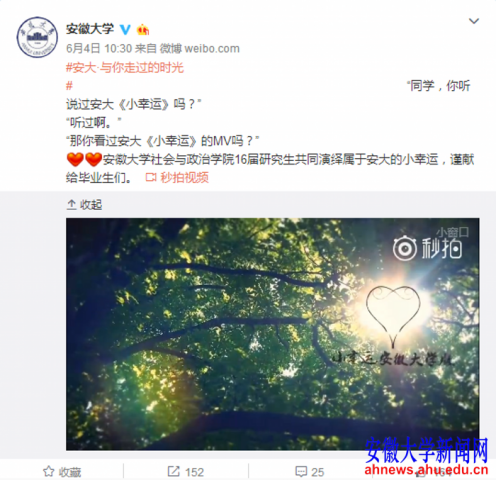 “我看见鸣磬广场人流如织,我看见合欢花开又到夏至,于是我思绪纷乱回到开始,那段,光阴的故事……”由社会与政治学院16届研究生共同演绎的安大版《小幸运》MV作为献给毕业生的礼物,在我校官方微博上一经推出便广为流传。