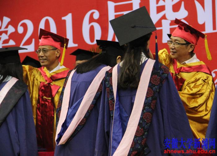 程桦代表学校向2016届毕业生圆满完成学业表示热烈祝贺,向所有关心支持同学们成长成才的广大亲友、校友和各界人士表示衷心感谢。他说,几年前,2016届毕业生带着青涩、带着梦想、带着期望来到安徽大学,经历了从青涩懵懂到成熟稳重的华丽蜕变,用言行和成功诠释和丰富了安大精神和大学文化的内涵,为学校建设发展倾注了汗水与力量,用青春年华与学校相伴相融、共同成长,用勤劳智慧成就了自己,也成就了学校。希望大家胸怀理想,坚定信念,从容走出校门;博学笃行,学以致用,踏实成就事业;肩负责任,勇于担当,有效服务社会。希望广大毕业生关注母校的发展,以自己的业绩为母校争光,让青春之花在精彩人生中美丽绽放。