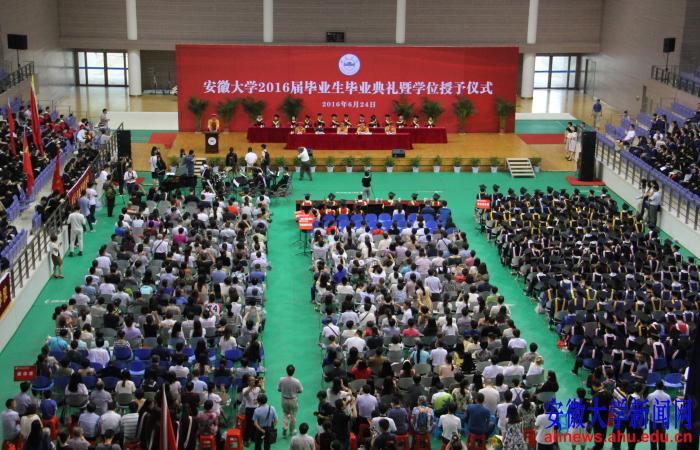 本网讯(新闻中心学生记者 武文斌 吴顺 张艺凡)6月24日上午,安徽大学2016届毕业生毕业典礼暨学位授予仪式在磬苑体育馆隆重举行。校党委书记李仁群,校长程桦,党委副书记、纪委书记胡小松,副校长虞宝桃,副校长程雁雷出席并在主席台前排就坐,校学位委员会成员在主席台就坐。程雁雷主持毕业典礼暨学位授予仪式。