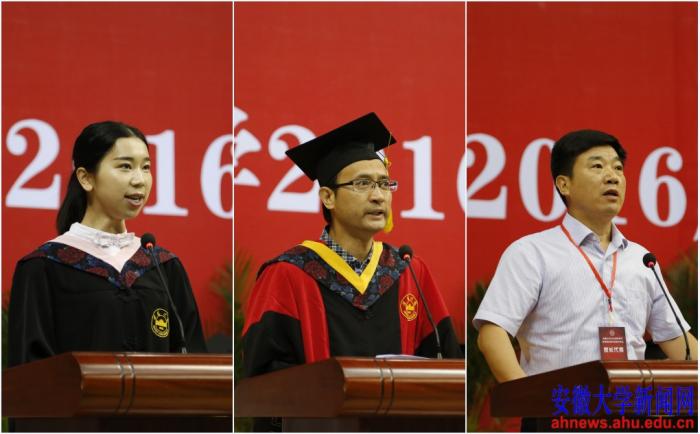 商学院2016届本科毕业生吴波、经济学院博士生导师蒋长流、学生家长代表钱培久发言