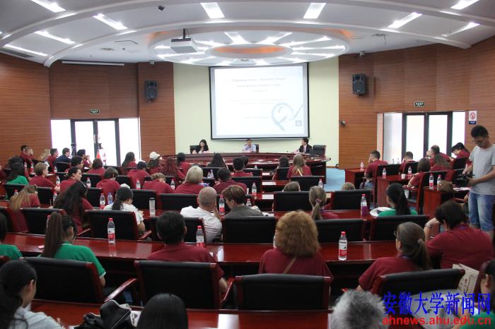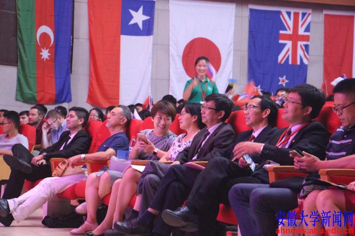 本网讯(学生记者 任燕 沈雨柔 王方仪 刘梓桐)7月12日上午,2016“徽韵·中国美”国际夏令营在艺术楼小剧场举行开营仪式。来自波兰、俄罗斯、日本、新西兰、乌克兰、智利等7个国家63名师生来到安大,体验徽文化,感受中国美。参加夏令营的外国学生虽然绝大多数都是第一次来到中国,但谈到中国文化,他们充满激情,“我喜欢中国美食,我知道中国功夫,长城和故宫……”。