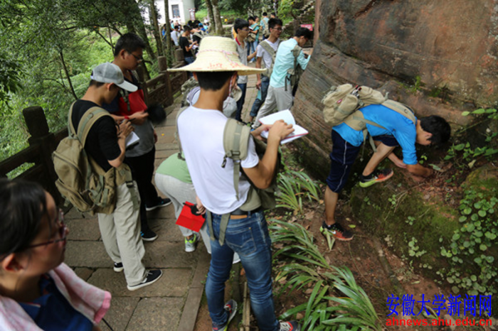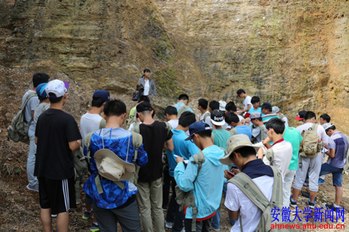 野外实习调查期间,他们参观了安徽省地质博物馆,在合肥市大蜀山和紫蓬山进行了安徽省地质公园火山地质作用、侏罗系红层沉积作用观察,进行了肥东郯庐断裂带张八岭断层变质岩及构造地质作用观察与调查,到淮南市进行洞山、罗山沉积地层及构造地质作用观察、岩层产状测量,在淮南市八公山国家地质公园观察和认识石林地貌、三叶虫化石、波痕构造、爬行迹构造,到休宁县齐云山国家地质公园开展丹霞地貌、沉积韵律观察与描述,开展了蓝田生物群剖面古生物化石及断层构造认识及调查,还在黄山世界地质公园进行岩浆岩、流水地质作用、球状风化、中高山地貌等观察与认识。