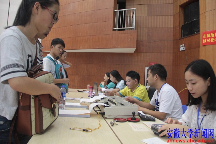 联合报到组设在适之楼多功能厅。在这里,教务处、学生处、财务处和保卫处的工作人员为新生提供招生录取咨询、“绿色通道”和助学贷款、费用缴纳和户籍迁移等方面服务。现场用投影显示新生报到情况的实时动态,财务缴纳、住宿办理和学院注册三个环节的完成情况,以及各院系新生报到情况。化学化工学院新生岳洋说:“之前因为没有银行卡,没有在网上完成学费和住宿费的缴纳,联合报到组提供的现场缴费平台很便利,这里既可以刷卡也可以现金支付,一会儿就办好了。”学校今年继续为家庭经济困难且无力支付学费的学生开辟“绿色通道”。申请国家助学贷款的学生也可以在现场进行咨询办理。