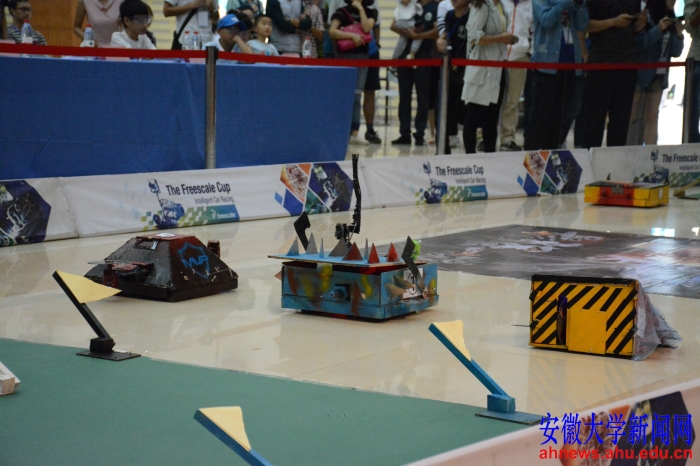 对抗赛是今年新加的环节,参赛队设计制作战车,在木质场地内按照比赛规则完成相应比赛项目。第一轮对抗赛随机平均分为A、B两组,赛场相应分为两方阵地。各方阵地均插有7个彩旗,双方对抗以锯木头的方式攻伐对方彩旗并守护己方彩旗,规定时间内抢夺彩旗数量最多一方获胜,进入下一轮比赛,另一方则淘汰。第二轮对抗赛以混战分胜负,各战车均负载两个气球作为得分点,在规定时间内,综合战车损坏情况和得分情况定出最终胜负。紧张激烈的比赛吸尽观众眼球,场上不断发出叫好声。
