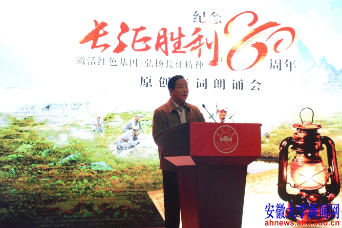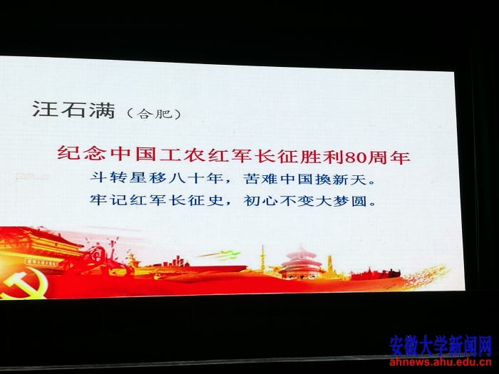 本网讯(新闻中心学生记者 江凌玲 陆笑)10月22日上午,纪念工农红军长征胜利80周年原创诗词朗诵会,在磬苑校区艺术楼小剧场举行。本次活动由安徽太白楼诗词学会、教务处和校团委联合主办。