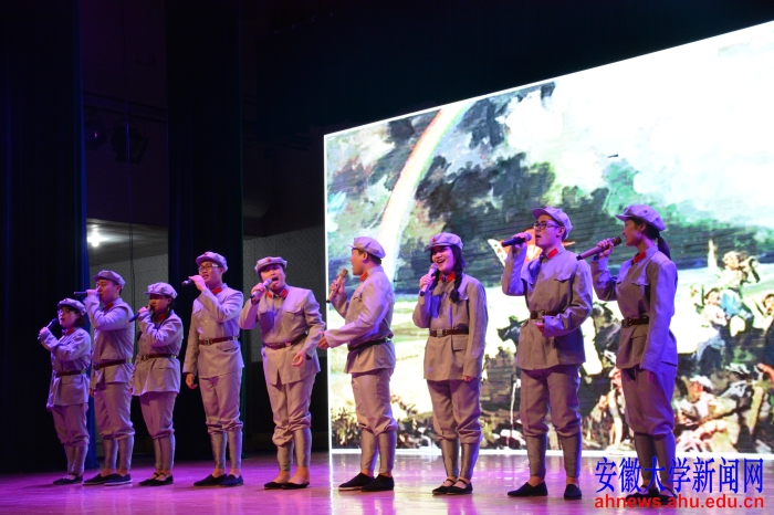 朗诵会上播放了由安徽太白楼诗词学会会员精心创作的《长征颂》、《南乡子·飞夺泸定桥》、《浪淘沙·九五赋》等60首诗词作品。省老年大学、校青年艺术团、电子信息工程学院、校老年大学师生表演了舞蹈《映山红》、《早春》、《五星红旗》,红歌联唱,合唱《军民大生产》和《红军不怕远征难》等节目。欢快的旋律、优雅的舞姿、深情的朗诵,呈献了红军将士在长征途中浴血奋战、克服艰难险阻的战斗生活,展示了中国共产党人坚定信仰、追求理想、敢于牺牲、勇于胜利的精神品格,诠释了长征精神的历史传承和新的时代内涵以及各族人民不忘初心、继续前进的信念与力量。