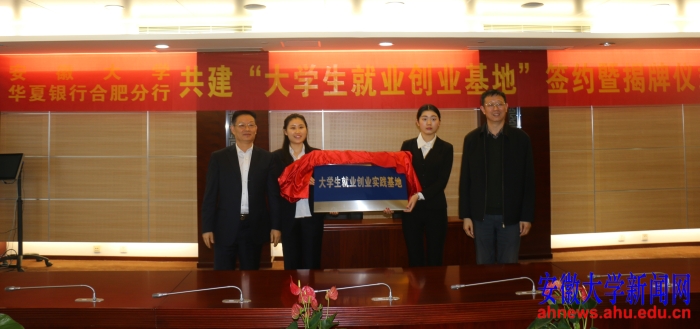 胡小松(右一)等为我校与华夏银行共建的大学生就业创业实践基地揭牌