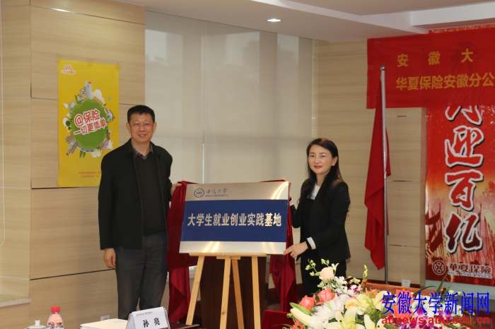 胡小松(左)等为我校与华夏人寿保险股份有限公司共建的大学生就业创业实践基地揭牌