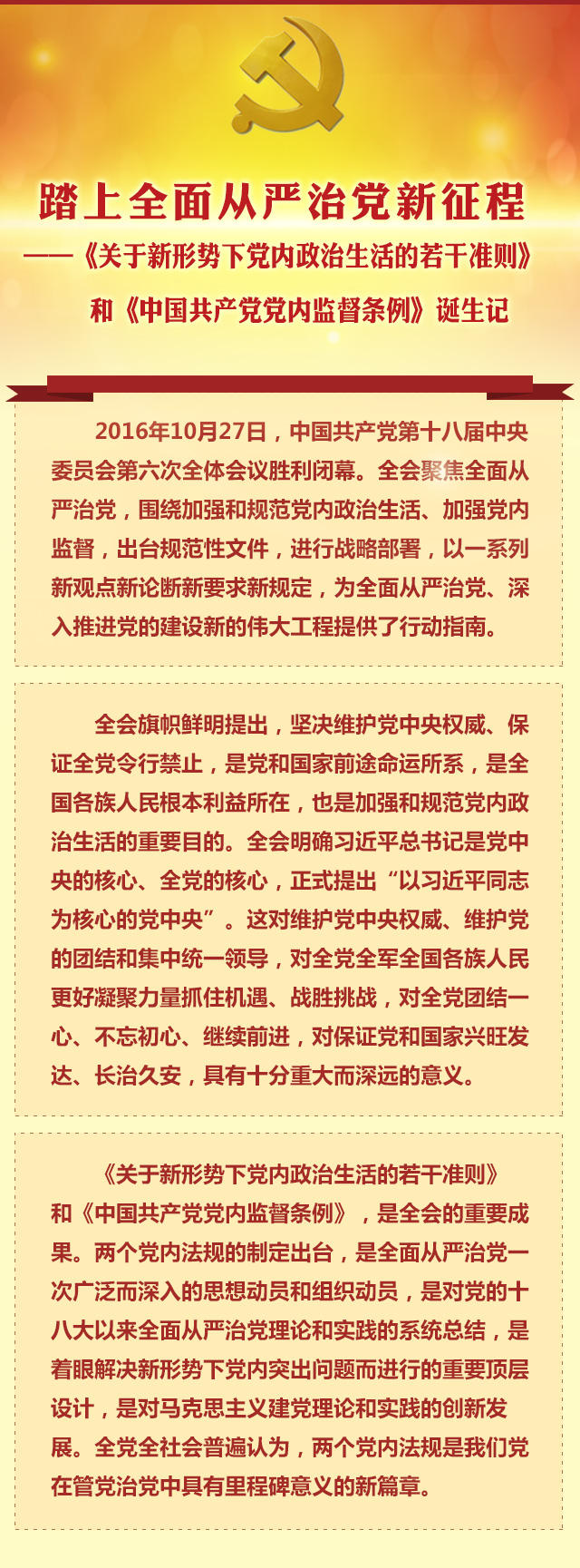 2016年2月,中央政治局作出决定,党的十八届六中全会专题研究全面从严治党问题,制定新形势下党内政治生活的若干准则,修订《中国共产党党内监督条例(试行)》,文件起草工作的大幕正式拉开。