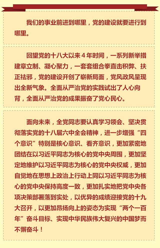 六中全会的召开,对于推进全面从严治党,解决党内存在的突出矛盾和问题,不断增强党自我净化、自我完善、自我革新、自我提高能力,意义重大。只有深刻认识领会全会的精神要义,才能在实践中坚定不移落实《准则》和《条例》的各项规定。