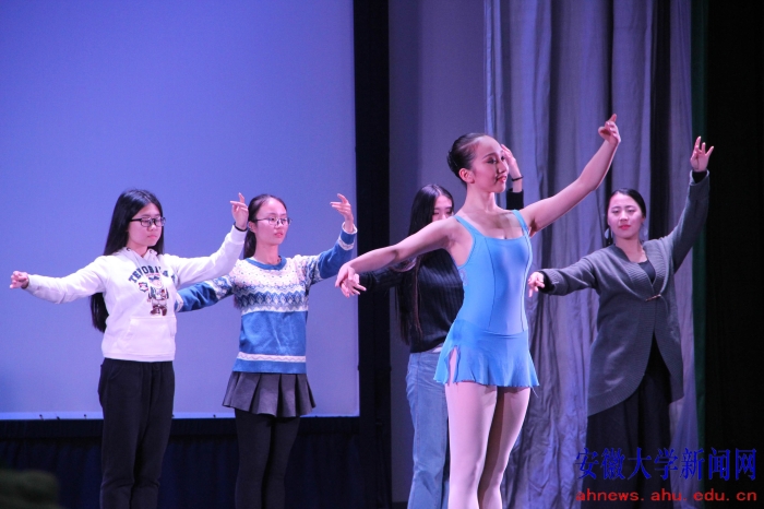 《古典女子四人舞》律动的舞姿,凸显了古欧洲宫廷女子的优雅,缓缓拉开了演出帷幕。中央芭蕾舞团独舞演员、国家一级演员刘琪作为主讲人向观众介绍了芭蕾舞的知识。她以芭蕾舞的基本情况为切口,让观众对这个源自意大利的舞种有了初步认识。为了更形象地展示“足尖上的艺术”,舞蹈演员还为观众表演了日常课堂练习的一些内容,擦地、小弹腿、斜线转等基本动作,扎实的功底和生动的表演获得掌声阵阵。主讲人还邀请同学上台体验了芭蕾的基本动作。