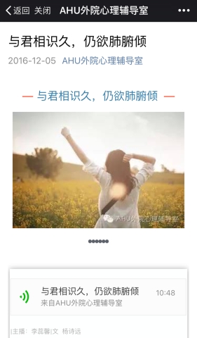本网讯(李瑞瑞)与君相识久,仍欲肺腑倾。这是外语学院心理辅导室近期推出的一条微信,这是一条带着语音的微信,标志着外语学院心理辅导室“外院心声”心理电台正式上线开通。