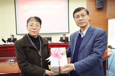 星报讯 12月23日下午,安徽大学“文华奖学金”颁奖暨图书捐赠仪式在安徽大学办公楼举行。文华奖学金由已故原安徽省政协主席、党组书记王明方捐赠稿酬所设,王明方夫人朱晓南和女儿王飞出席,为文华奖学金获奖学生颁奖,并捐赠了王明方生前所读图书。朱晓南称,在安大设立“文华奖学金”是王明方的心愿,他们全家都希望这个奖学金能够永久办下去。