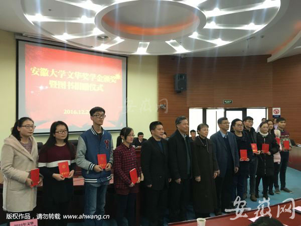 新安晚报 安徽网讯 12月23日下午,安徽大学文华奖学金颁奖暨图书捐赠仪式在安大新区办公楼举行。王明方同志的夫人朱晓南女士和女儿王飞出席并亲自向20名获奖学生颁奖。
